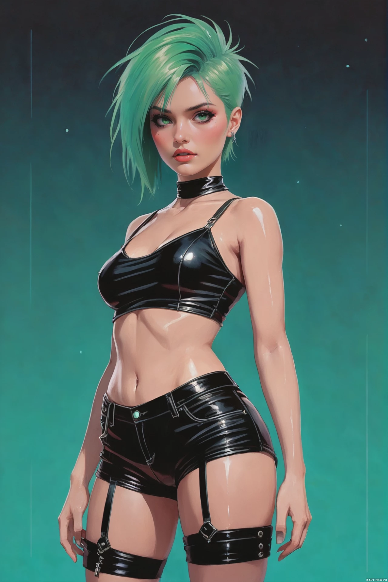 leather attire, including a corset and stockings that are adorned with straps or possibly suspenders. Her makeup includes what appears to be