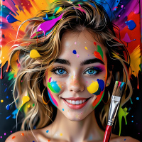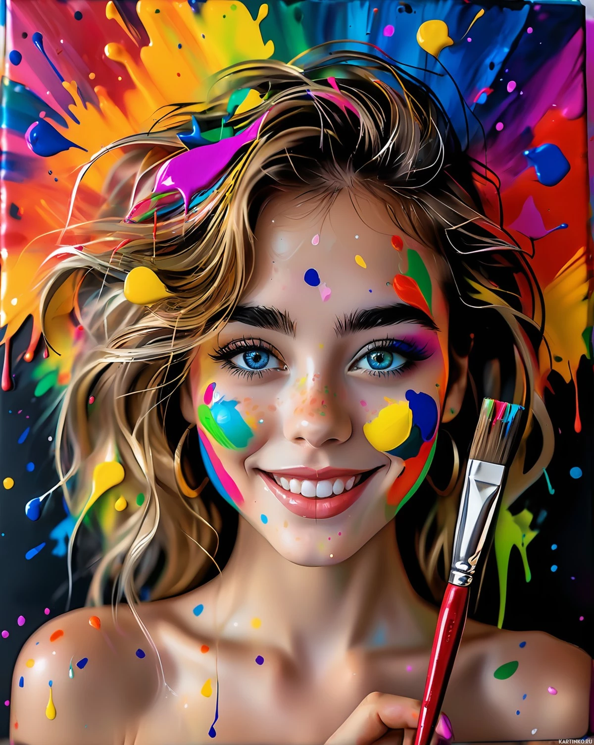 loose waves, and she has a bright smile. She's holding a red paintbrush near her chin, suggesting an atmosphere of creativity or artistry. The background features an explosion of different colored paints in a dynamic splash pattern, which adds to the vivid theme of the image.