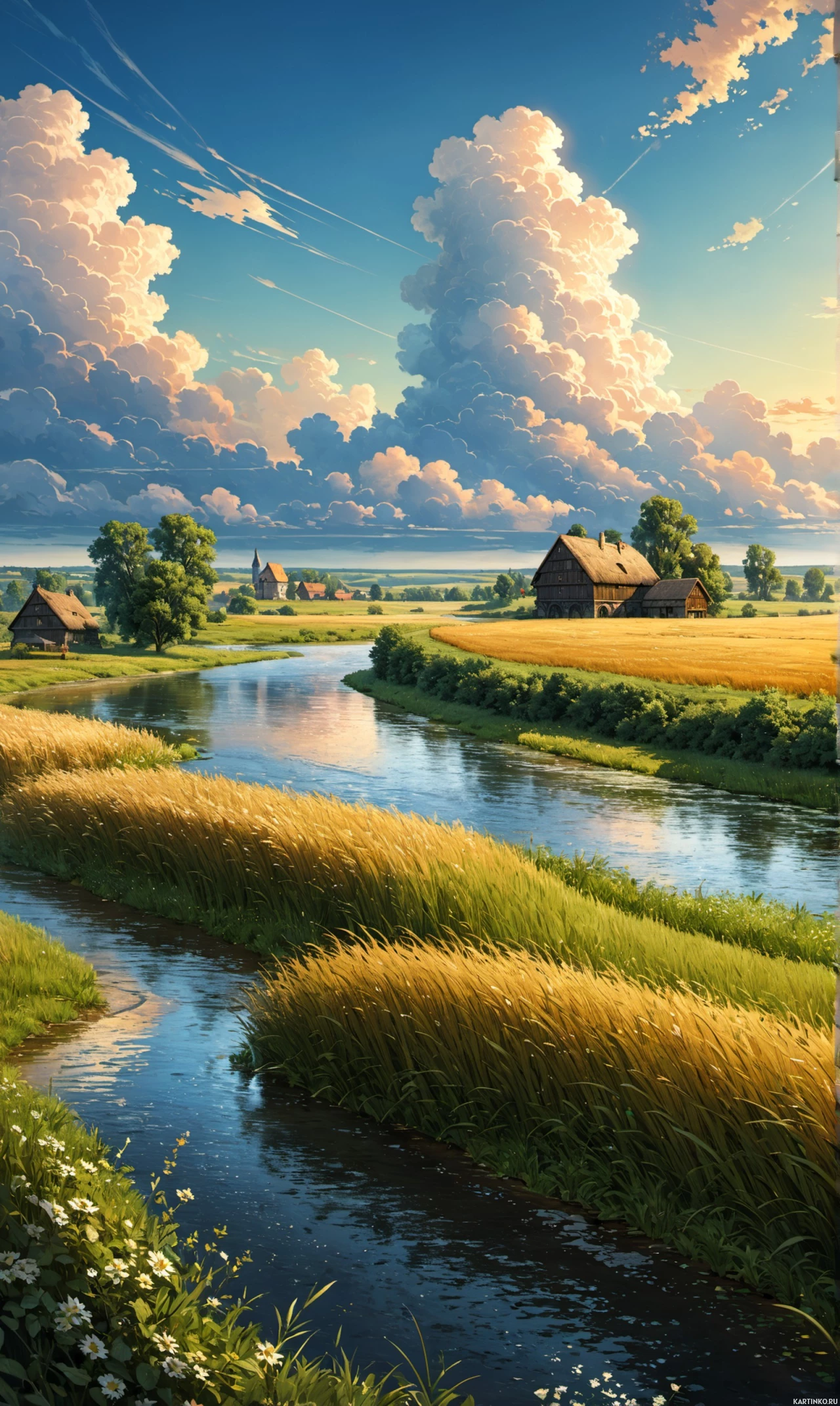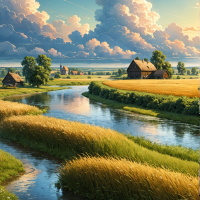 architecture of the buildings is simple yet charming. To the right of the image, towering over the landscape, are large clouds. These clouds seem to be full and heavy, possibly indicating an impending rain or storm. The overall atmosphere of the picture is tranquil and picturesque, with a focus on natural beauty and simplicity.