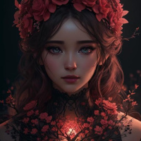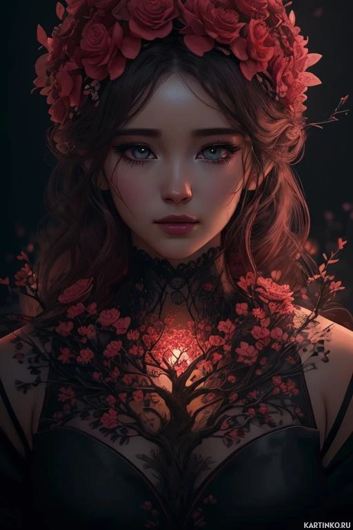floral design adorning her head, and there are flowers scattered around her. She has