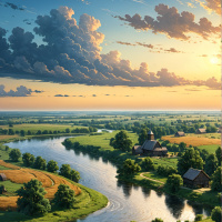 a sense of depth and natural diversity to the scene. A river meanders through the center of the painting, reflecting some of the sky's colors and adding a focal point that guides the viewer's gaze from one element of the composition to another. The water is calm, with no visible movement or disturbances. In the distance, there are houses which seem to be part of a small village or hamlet. The presence of these human-made structures contrasts subtly with the natural elements in the foreground and background, hinting at human habitation in this pastoral setting. The colors used in the painting are soft and harmonious, contributing to the overall tranquility of the scene. The use of light and shadow suggests a time of day when the sun is low on the horizon, creating long shadows that add texture and dimension to the landscape.