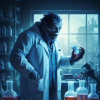 a science fiction or horror aesthetic due to the man's intense expression and the moody lighting in the lab.