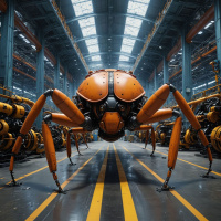 workshop setting. This robot has eight legs and is colored in shades of orange and red, with visible
