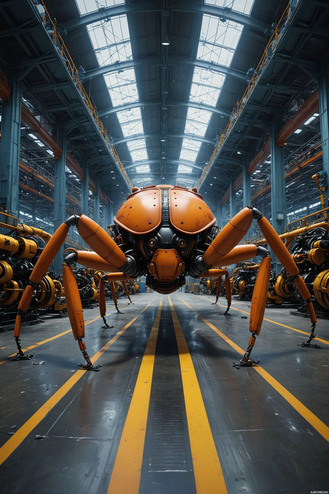 The image depicts a large, industrial robot resembling a giant mechanical arachnid situated in what appears to be a factory or
