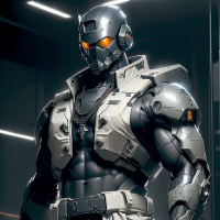 futuristic armor with visible mechanical components and a helmet. This attire suggests