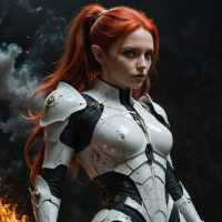 a futuristic armor-like outfit with metallic design elements and gold accents. Her expression appears contemplative or serious as she gazes to the side. The setting suggests a dramatic or intense scene, possibly related to battle or conflict, indicated by the smoke and fire in the background.