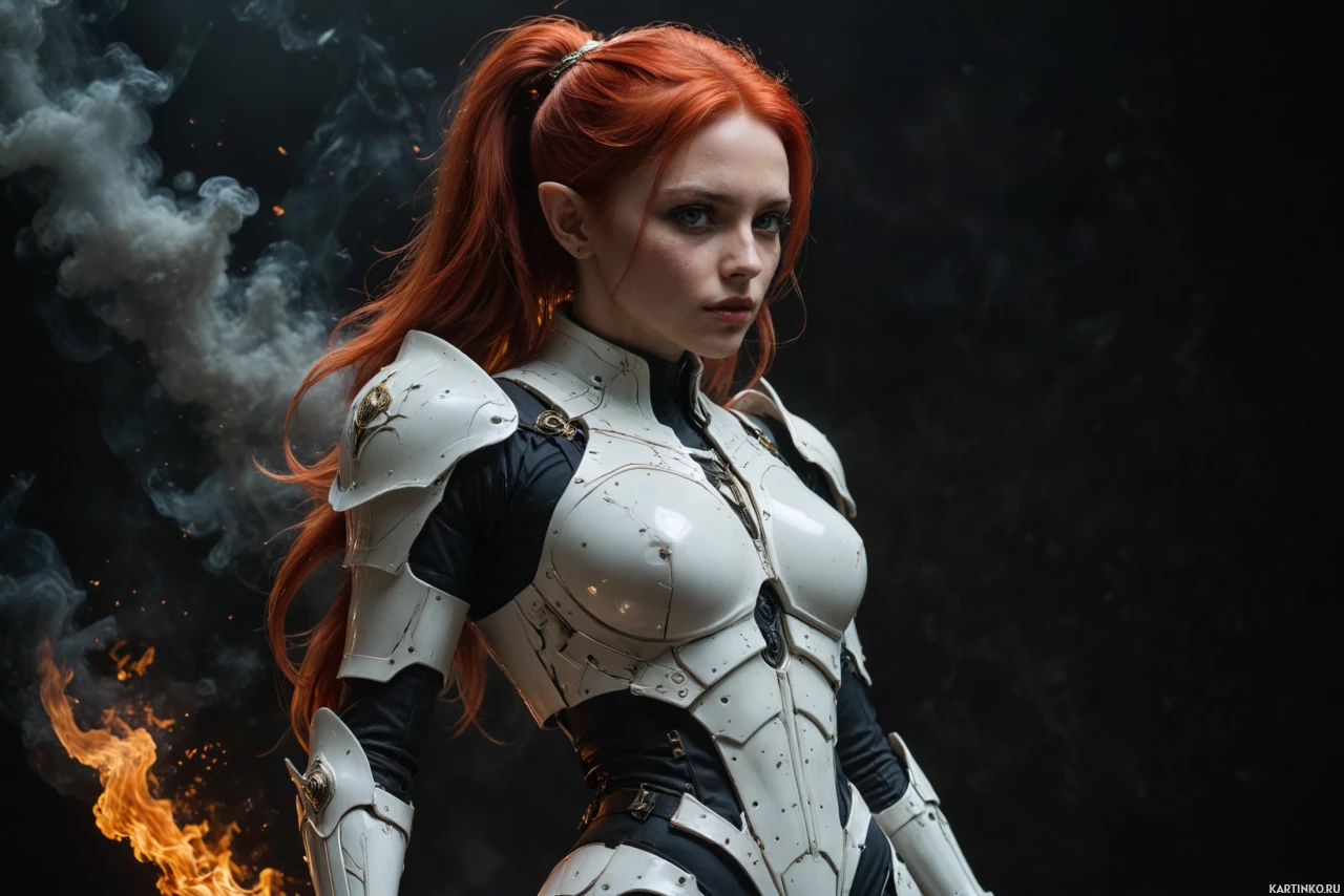 a female character with red hair, depicted in a science fiction context. She is wearing