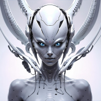 blue color, and there are small metallic wings extending from the sides of its head, adding to the fantastical nature of the design. There is also a hint of what could be interpreted as hair or a headdress made of wires or tubes, contributing to the robot's futuristic and possibly cyberpunk theme. The overall impression is one of