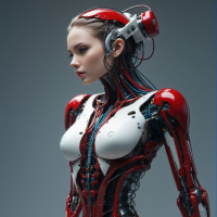a metallic frame and is adorned in red and white, giving it an elegant and sleek appearance. The robot's design includes human-like muscles and veins, as well as what appears to be