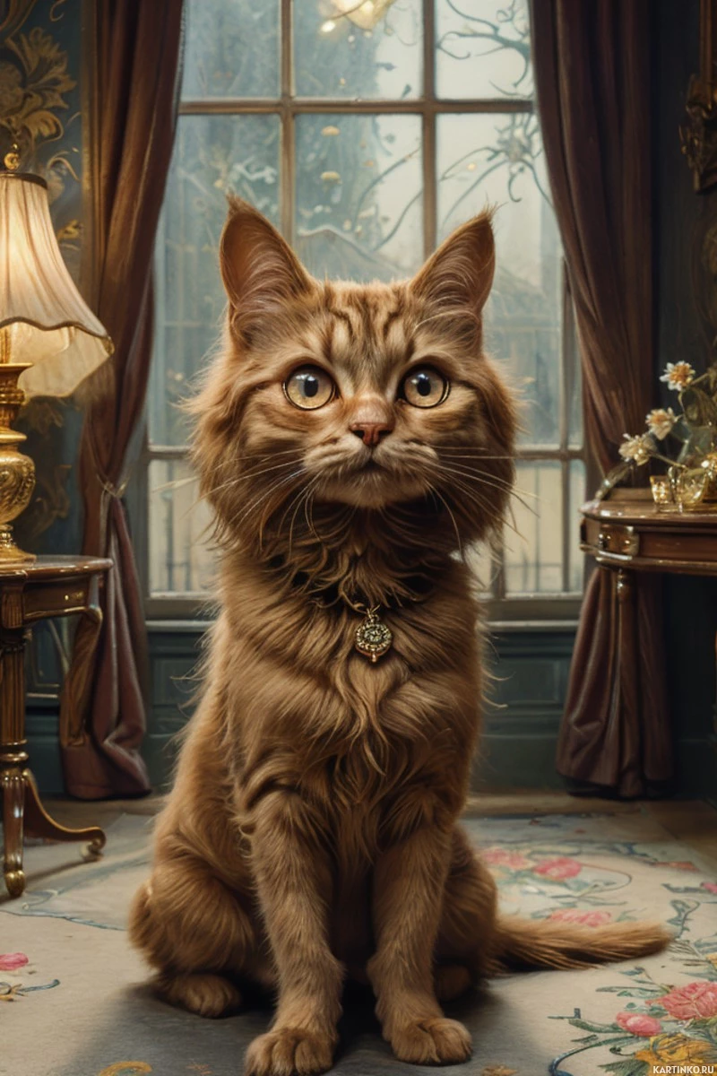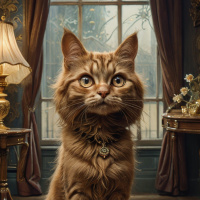 a sense of attentiveness or curiosity. The background is richly detailed with elements like a chandelier, window curtains, and a small table with a lamp, suggesting