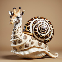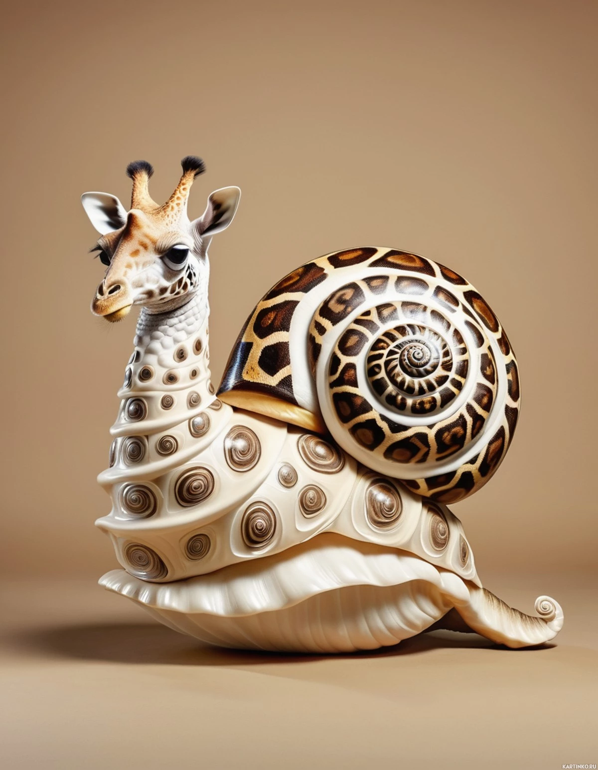 artistic piece features a shell, reminiscent of a snail, with the body adorned with a pattern mimicking a giraffe's coat. A head-like structure on top resembles the face of a giraffe, complete with eye spots and ear-like structures. The sculpture is set against