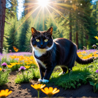 bright sunlight filtering through the tree canopy above. The cat is looking off to its left, and there are various flowers around it—yellow ones that could be marigolds, and possibly some other species—adding