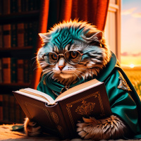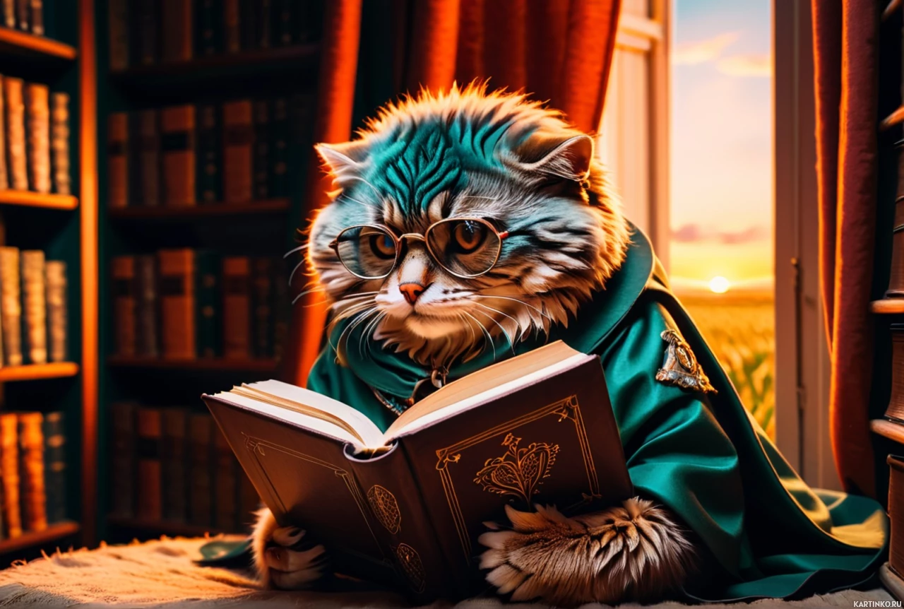 The image features a whimsical illustration of a cat wearing glasses and reading a book. It is sitting at a desk, which appears to be filled with