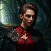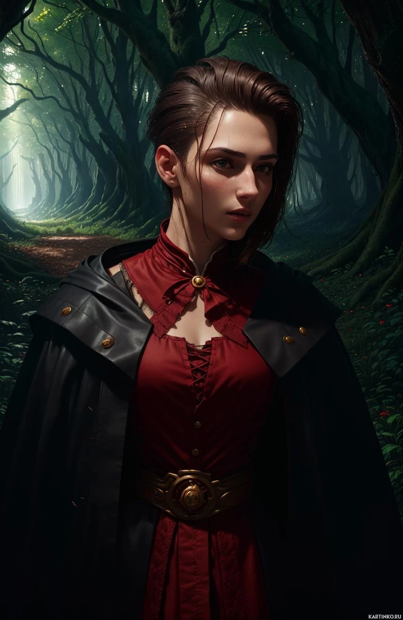 a forest setting, as suggested by the presence of trees and what seems to be a dirt path in the background. The character is wearing a red jacket or cloak over