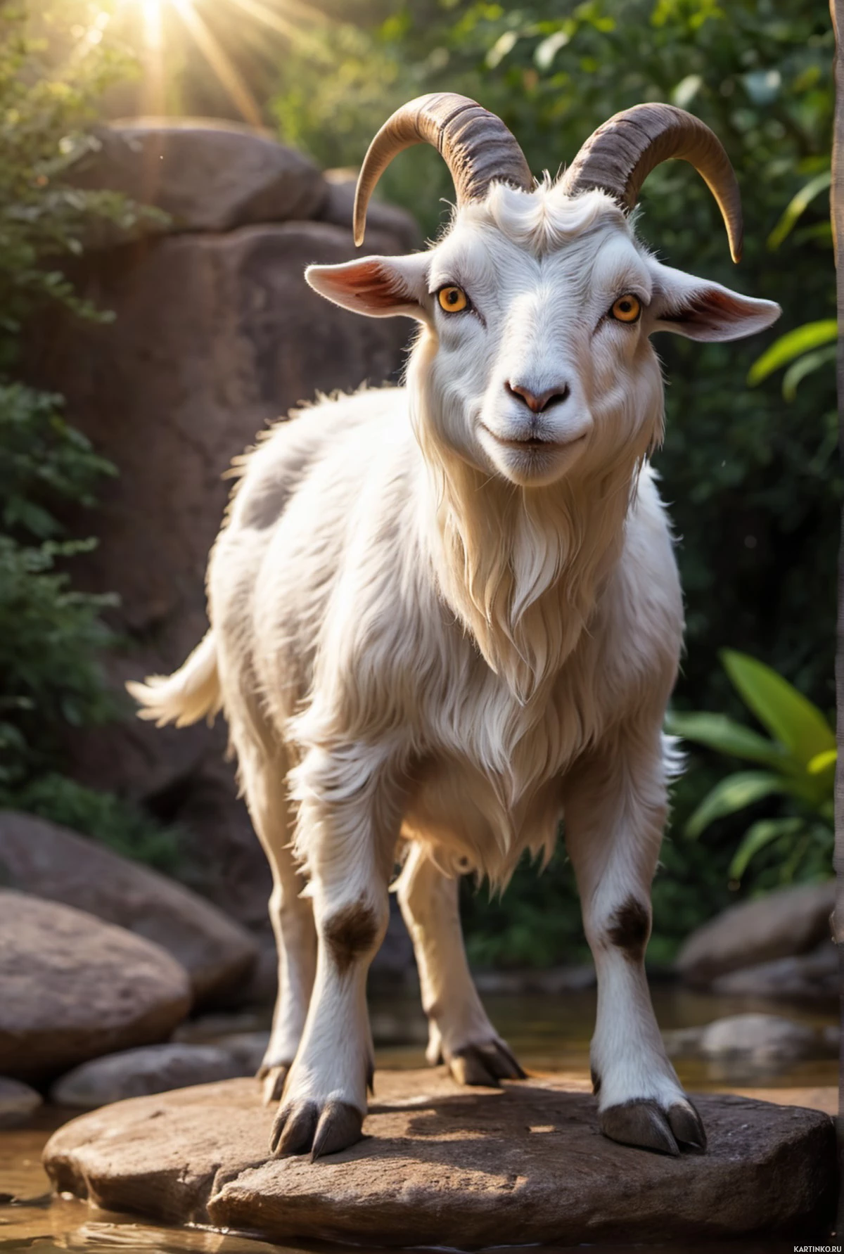 body of water that could be a pond or lake adjacent to the platform where the goat stands. The sun seems to be shining from the left side, casting
