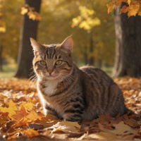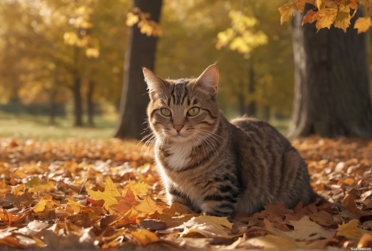 early morning due to the warm sunlight filtering through the canopy and casting dappled shadows on the cat and ground. The colors in the image are vibrant with the rich orange hues of the leaves contrasting against the green of the trees and the greyish tones of