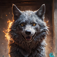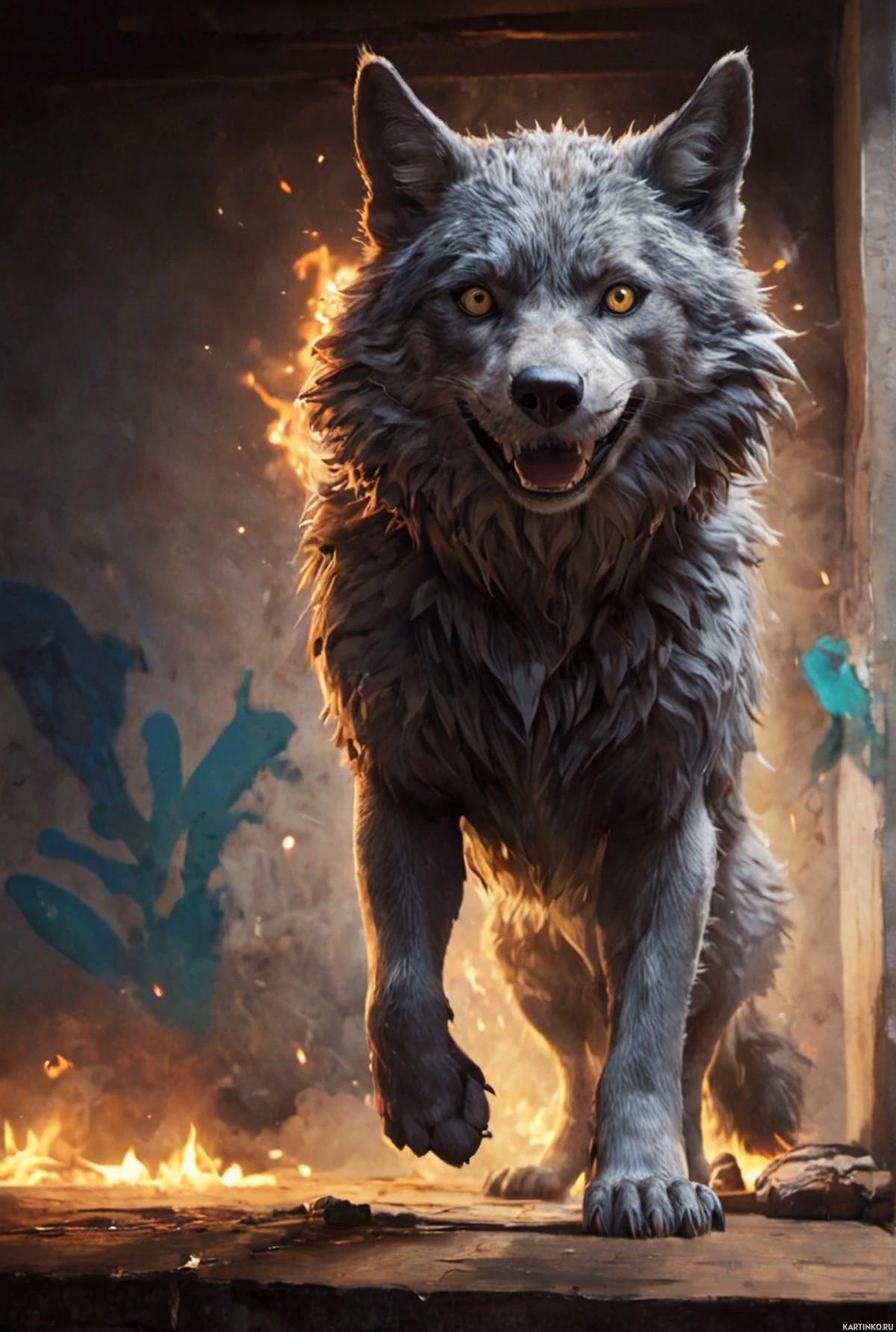 yellow eyes, standing amidst flames. The wolf appears to be in a somewhat anthropomorphic pose, with its