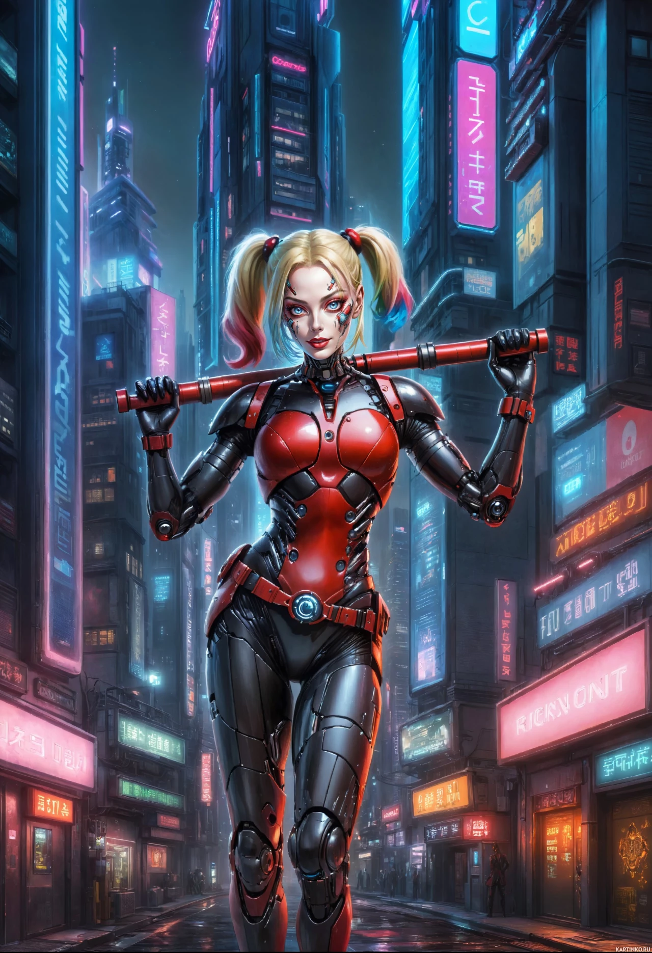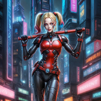 The image depicts a character that appears to be Harley Quinn,