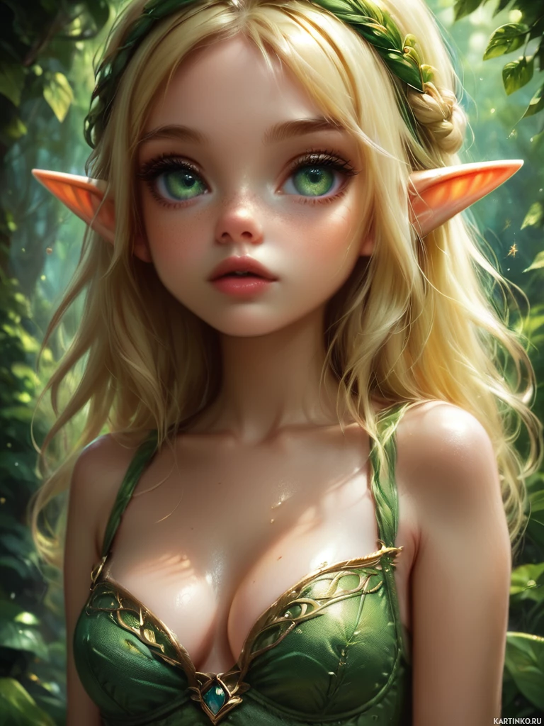blonde hair, pointed ears characteristic of elves in fantasy lore, and is adorned with what seems to be a crown or headband. She is wearing