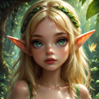 fantasy creatures in various media. The character is dressed in an outfit that suggests a green color theme, likely representing the leaves or foliage typically associated with elves. There's also some gold detailing on her clothing and accessories, adding to the magical or fantasy element of her appearance. The background is lush and naturalistic, depicting an underbrush scene with various shades of green and hints of other foliage, which complements the character's attire. The lighting in the image is soft and appears to be coming from above, creating a gentle ambiance that enhances