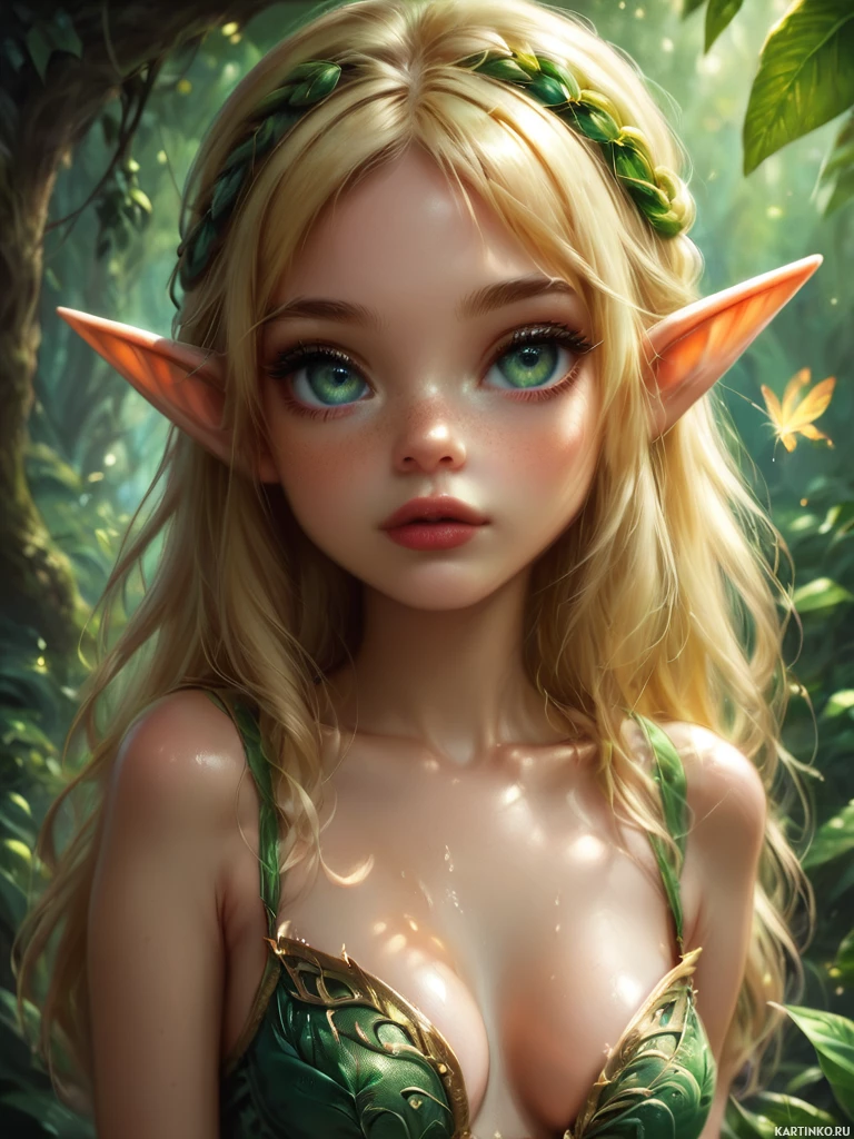 blonde hair and striking blue eyes. She has pointy ears, indicative of her elf-like nature, which are often associated with