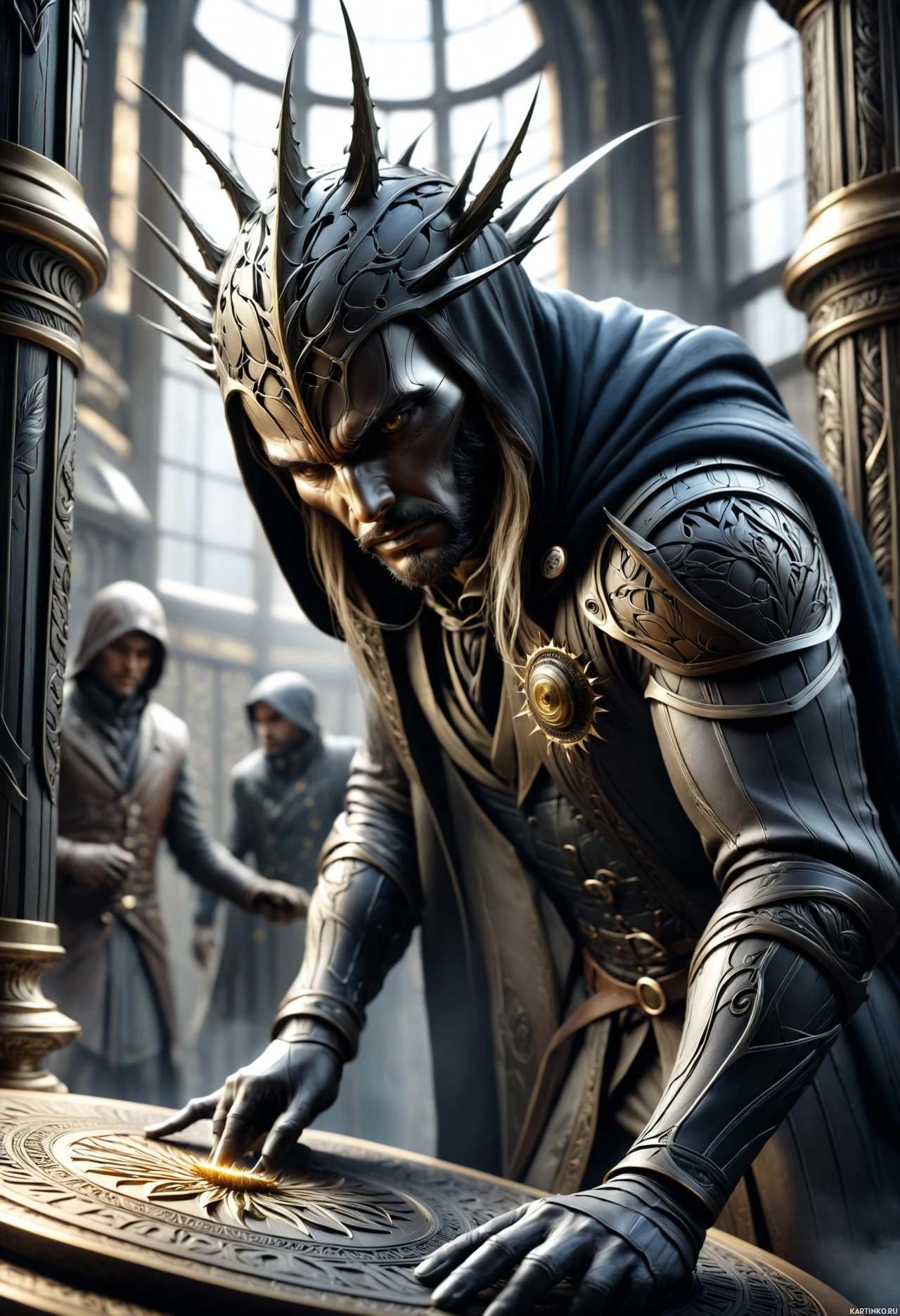 a hooded cloak with intricate embroidery that suggests wealth or nobility, as well as a helmet-like headpiece with pointed tips on the sides, which could be interpreted as an indication of status or perhaps magical abilities related to these points. He is holding what appears to be a map or chart in his hands, suggesting he might be planning a journey, consulting something significant, or studying