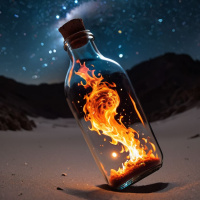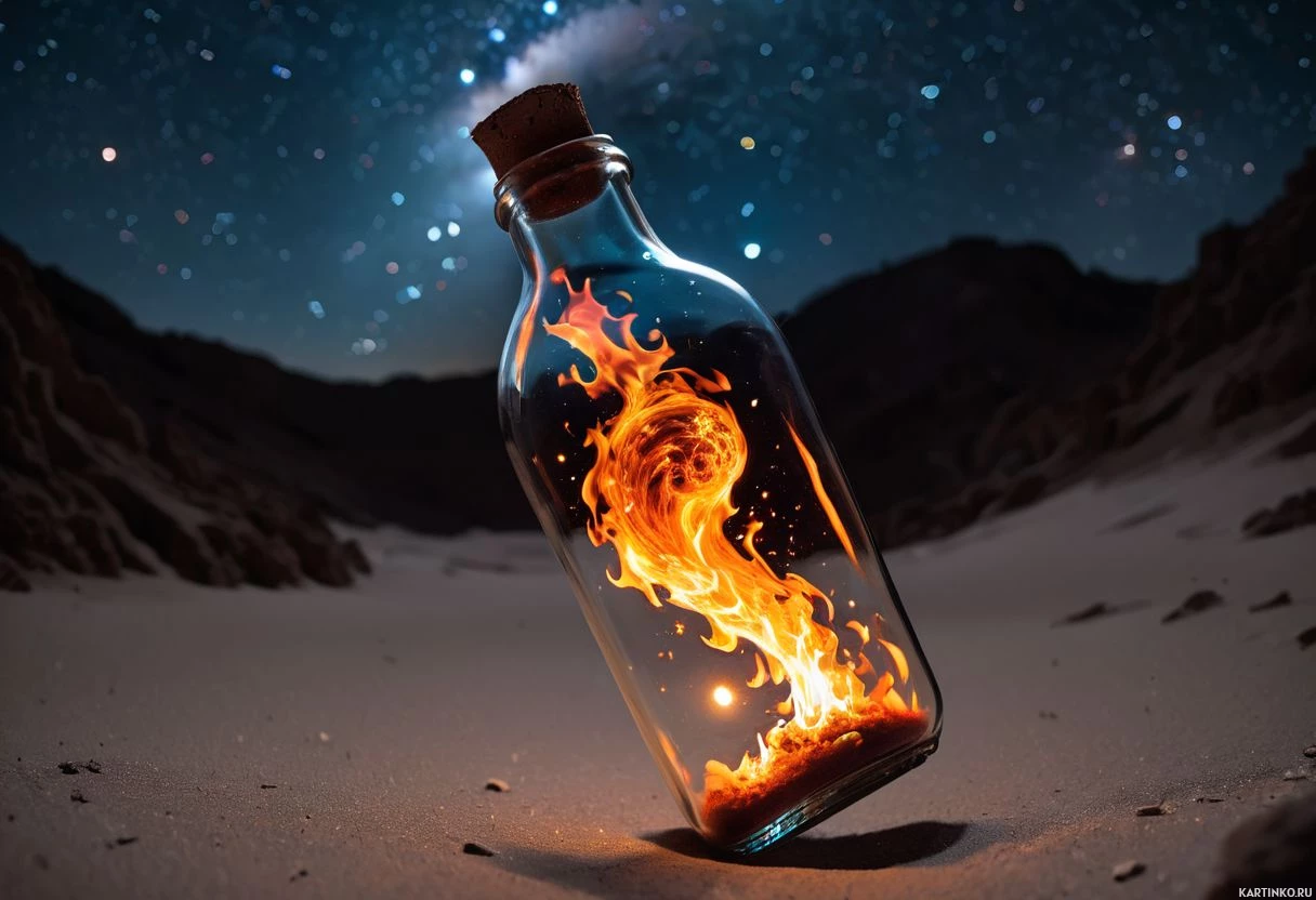 The image depicts a bottle with a fire-like substance inside. The bottle is open, and there are