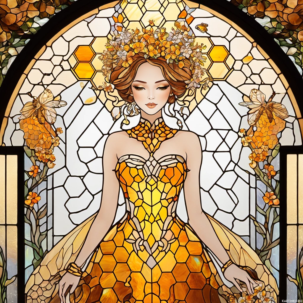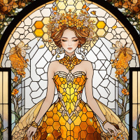a high neckline and is embellished with a pattern that might include gilded details or jewels. Her arms are resting at her sides, and she seems to be in a pose of elegance and stillness. Above her head is an arched structure that resembles a window or doorway, possibly made of stained glass due to the muted light filtering through. The frame of this structure appears to be carved from dark wood with intricate designs around it, enhancing the medieval or fantasy setting suggested by the character's attire and the surrounding elements. The ground is covered with what looks like a bed of flowers, possibly orange in color, which adds to the vibrant and festive atmosphere of the scene. The overall style of the image is detailed and realistic, with a focus on fantasy elements that evoke a sense of fairy tales or historical romance.