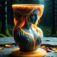 golden hair that cascades down her shoulders, and her skin appears pale, suggesting she might be of a non-human or supernatural race. Her eyes are large and captivating, with a hint of sadness in them. The character is wearing