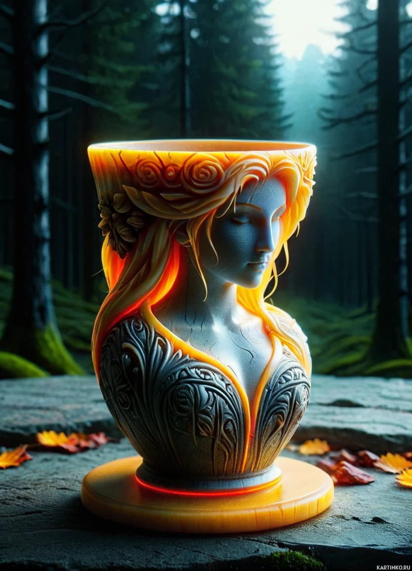a forest clearing, with misty light filtering through the trees, contributing to an atmosphere of mystery and otherworldliness. The overall tone of the artwork is serene yet poignant, evoking emotions from the viewer.