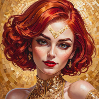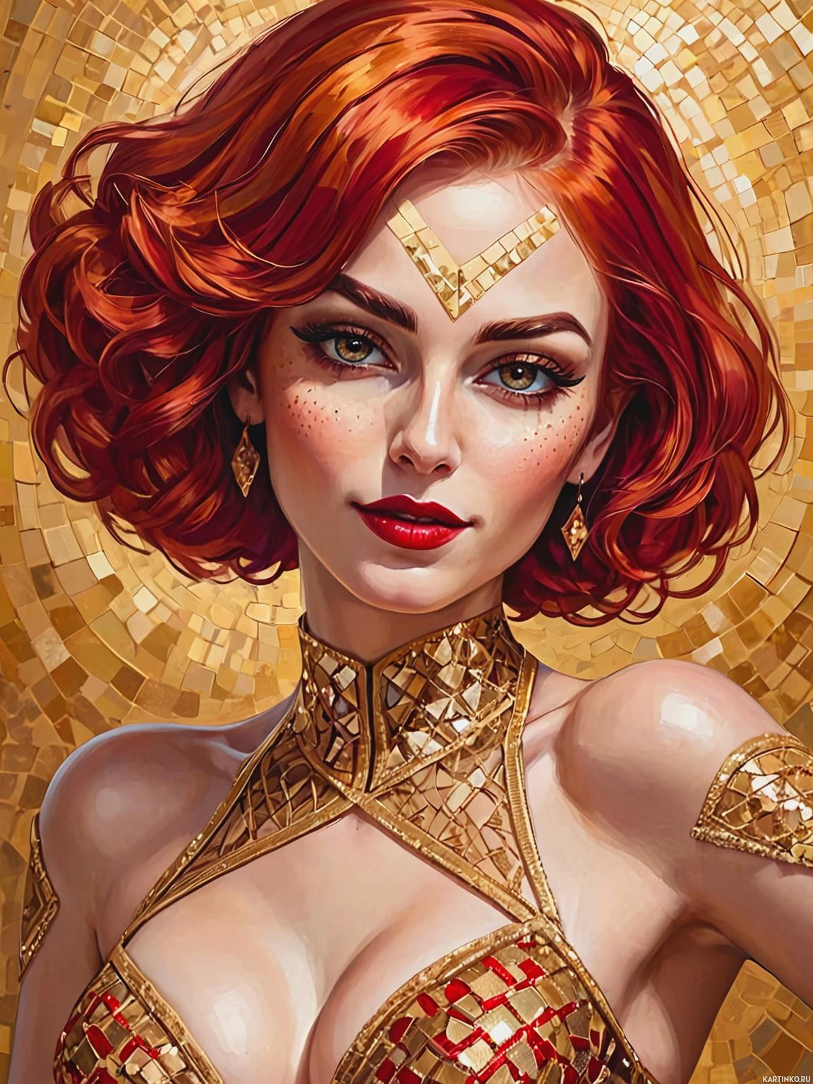 a young woman with red hair, adorned with gold accessories such as earrings and a chest piece that appears to be armor. Her eyes are yellow with red accents, which might be interpreted as a stylized take on eye makeup or could suggest an artistic choice for