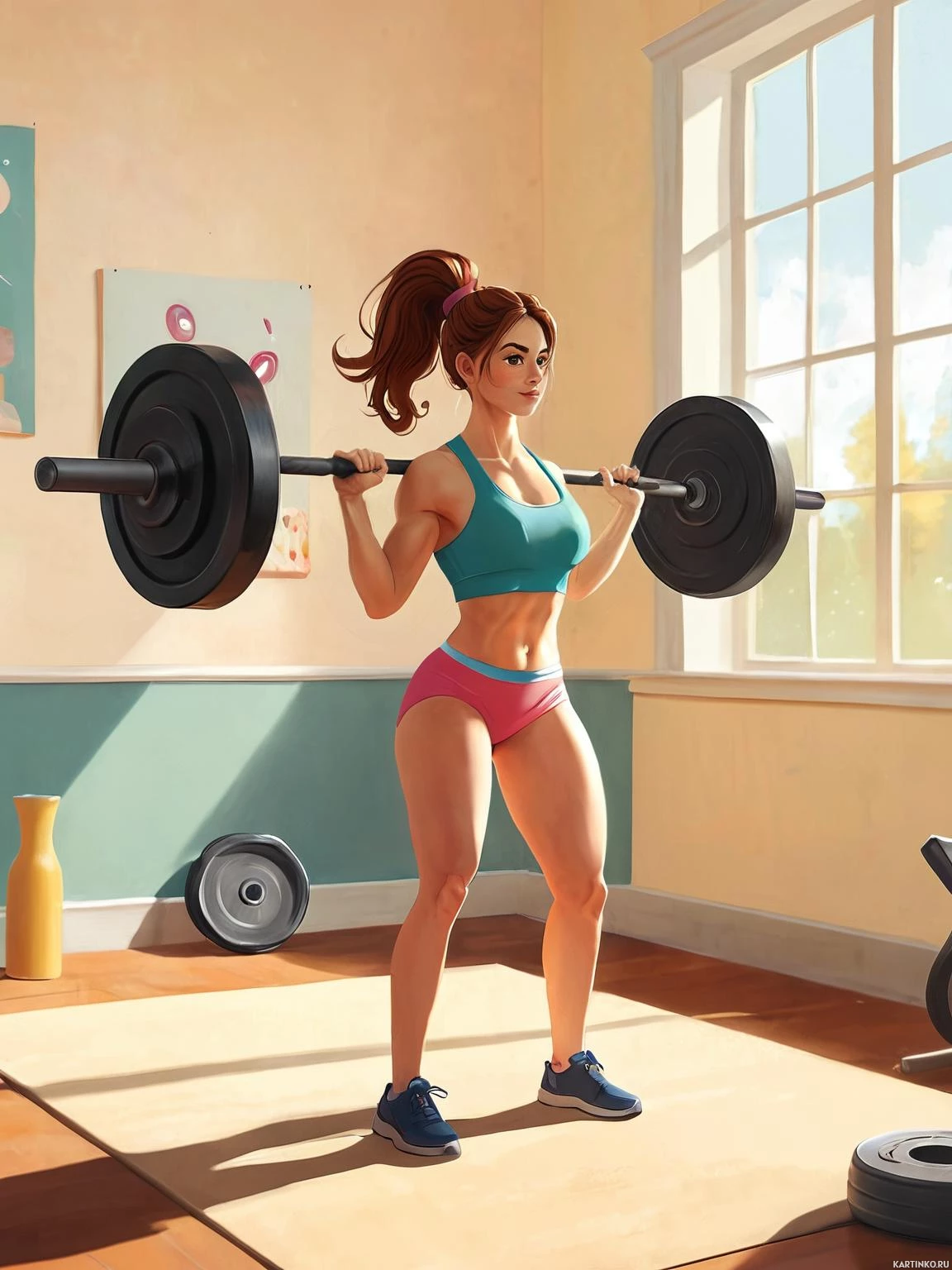 short hair and is wearing a sports bra with pink accents, blue shorts, and white sneakers. Her muscles are well-defined, indicating that she engages in regular
