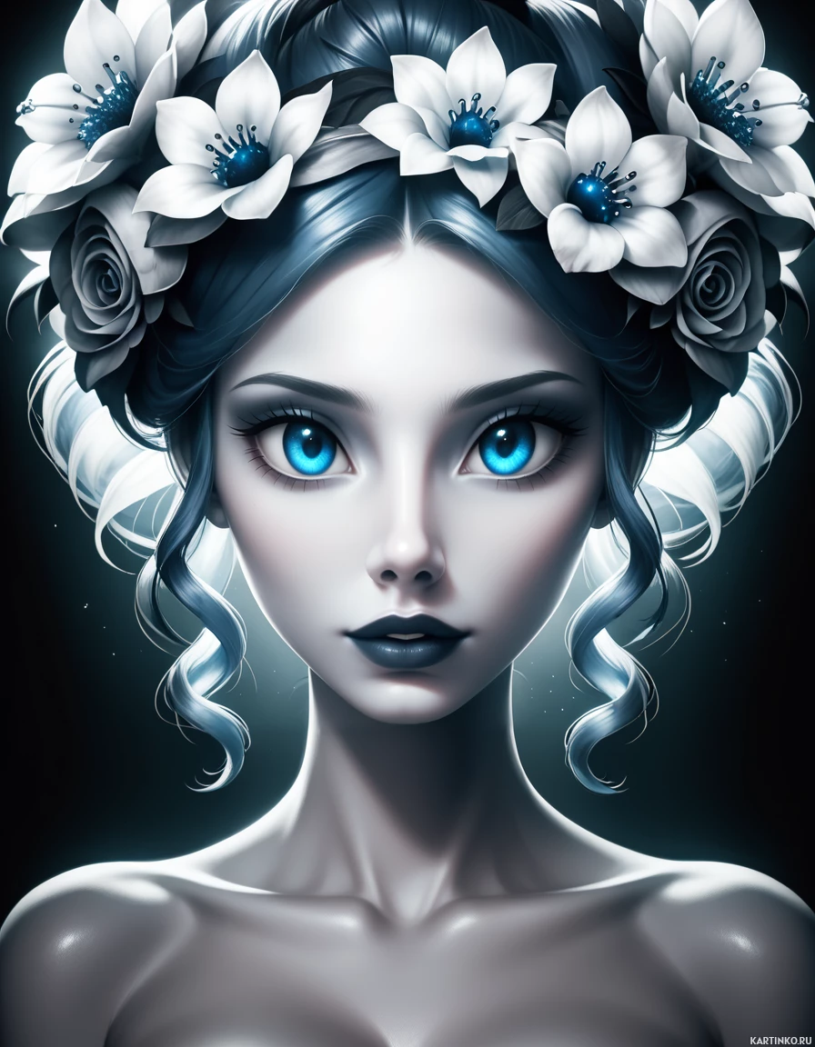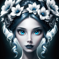 a flower crown featuring white flowers and blue gemstones, adding to her mystical or fantasy-like appearance. Her skin appears translucent or ethereal, with visible veins or a similar pattern that suggests an otherworldly quality. She has