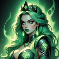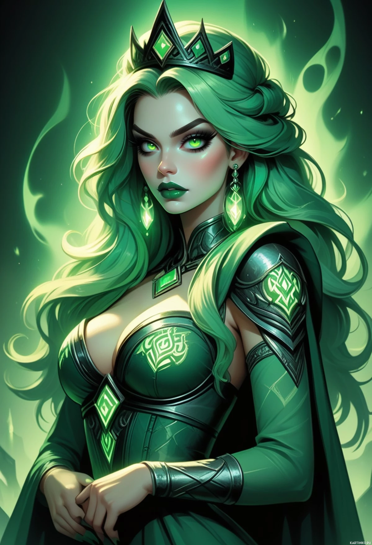 The image features a stylized character that appears to be a female warrior or fantasy queen. She has long green hair and striking