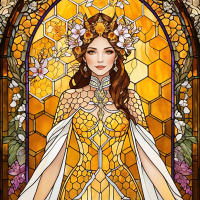 level of craftsmanship. The background features stained glass window panes with