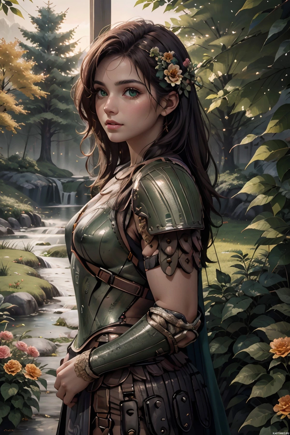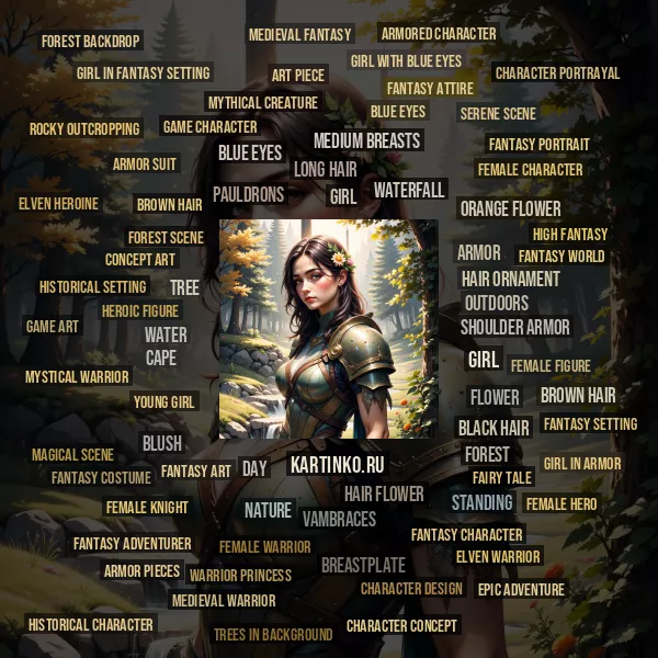 brown hair and is wearing armor that suggests she might be a warrior or someone of importance in the context of the narrative her image represents. On her shoulder, there's