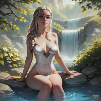 a rock formation that appears to be part of a natural spring or waterfall setting. Her pose suggests relaxation and enjoyment of her surroundings. The environment around her includes