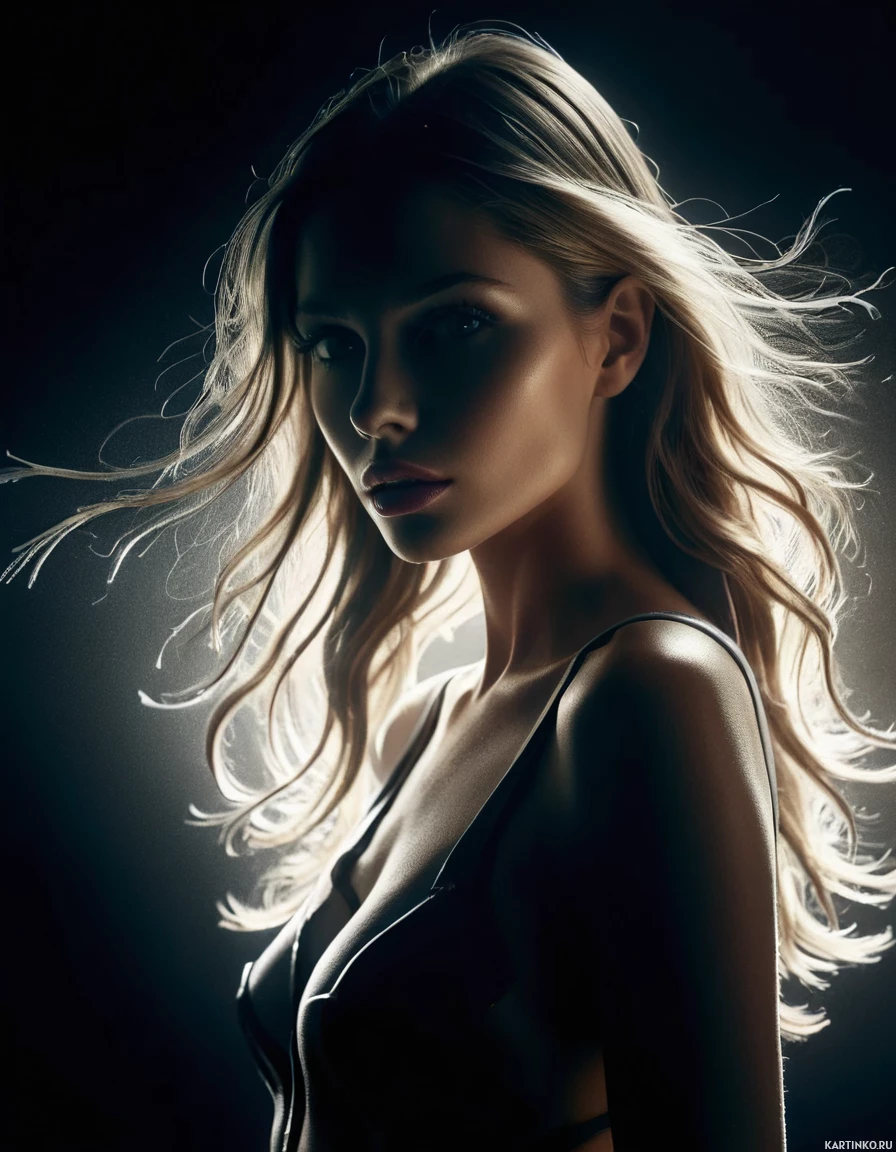 thin straps or a tight-fitting top that accentuates her collarbone. The lighting in the photo is soft, possibly from a source behind her, casting
