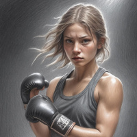 a female character wearing boxing gloves and striking a fighting pose. She has short