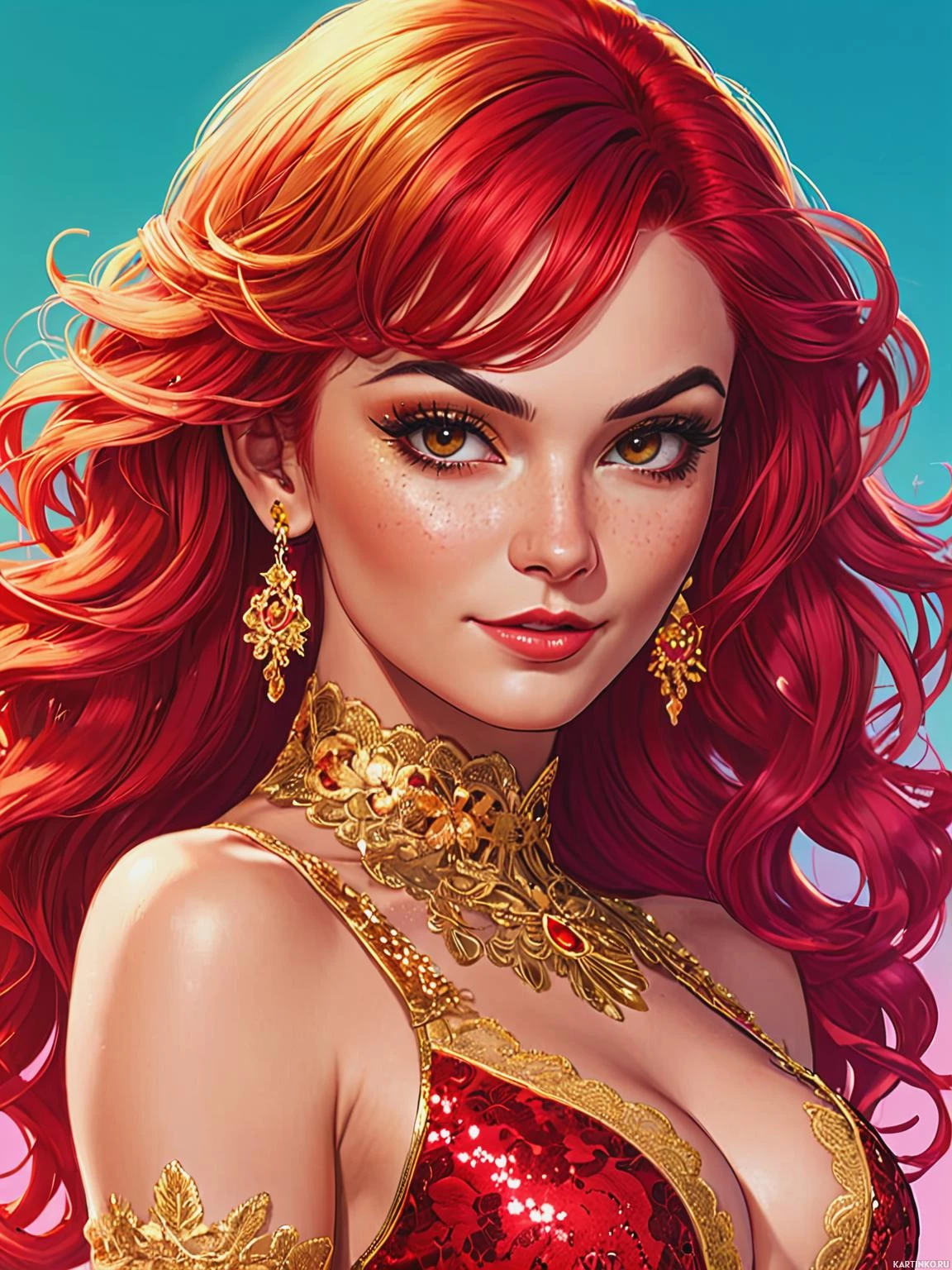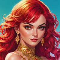 female character with vibrant red hair. She has striking