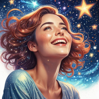 an open smile on her face, expressing joy and wonder. Her eyes are looking up towards the sky. The backdrop features a galaxy-like pattern filled with stars, adding to the cosmic theme of the artwork. There is also