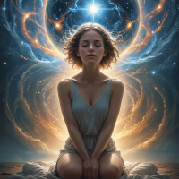 brown hair and appears to be in a state of deep thought or perhaps enjoying a moment of enlightenment. The background is filled with