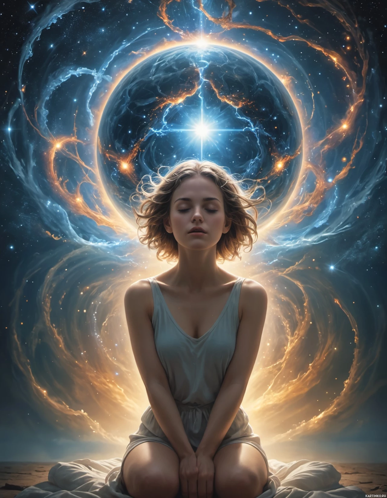 The image depicts a woman with her eyes closed, sitting on her knees in front of an otherworldly and mystical backdrop. She has long
