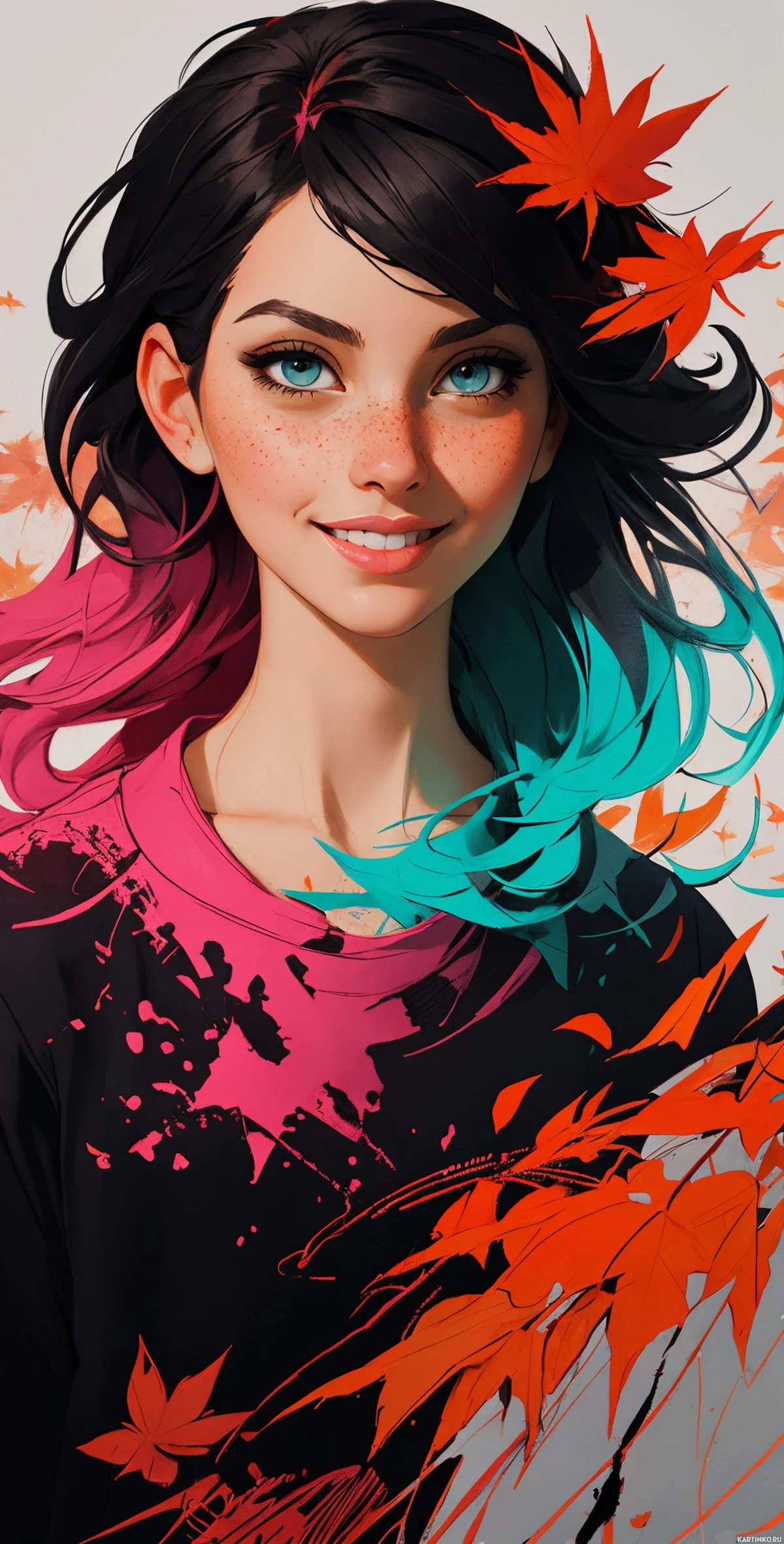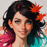 a female character with vibrant blue hair and pink highlights, which are accentuated with what appears to be autumn leaves around her head. She has large