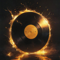 The image features a large, circular golden record surrounded by flames. This symbol is often associated with music and the recording industry due to its iconic design as an album cover or music award. The artwork conveys a sense of celebration or achievement within the context of the music world.