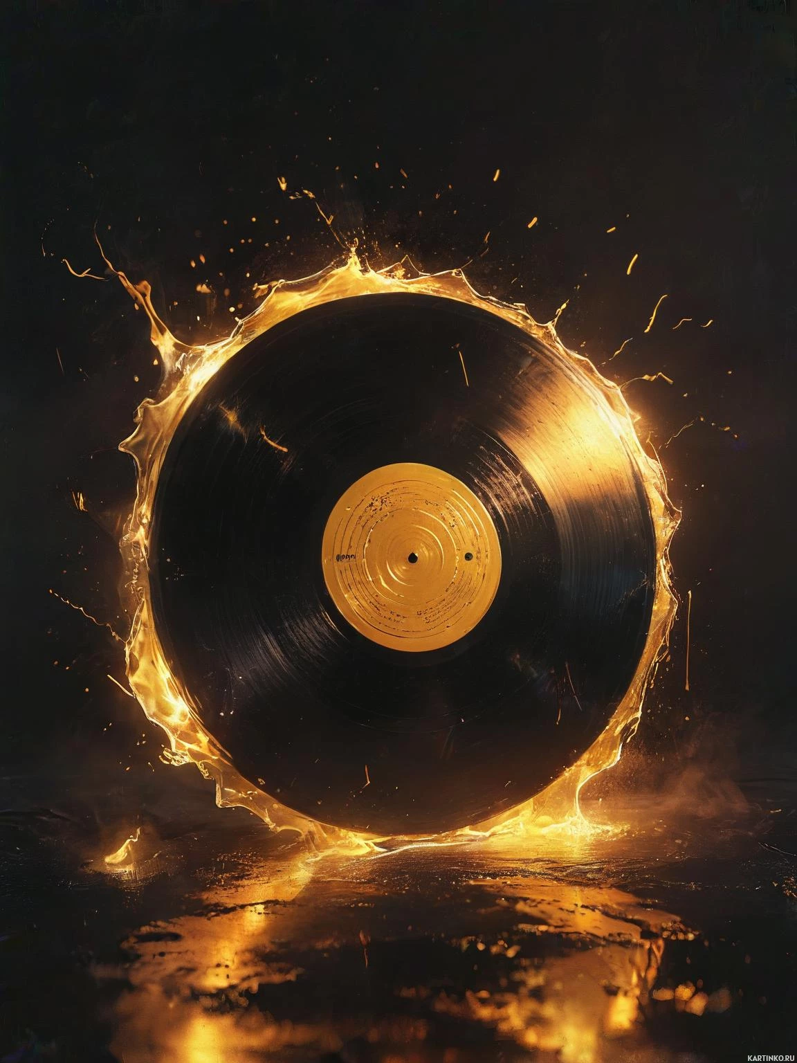 На картинке изображена большая золотая, круглая пластинка, окруженная языками пламени. Этот символ часто ассоциируется с музыкой и индустрией звукозаписи благодаря своему культовому дизайну – он напоминает обложку альбома или музыкальную награду. Работа передаёт ощущение торжества или достижения в мире музыки.