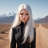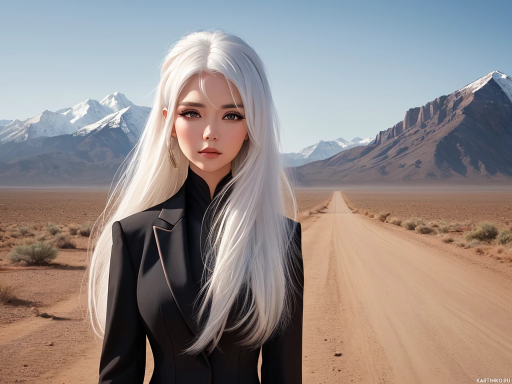 white hair, standing in what appears to be a desert environment. The character is wearing an outfit that seems to be part of a steampunk or futuristic style, with elements suggesting a leather or armored appearance. The setting includes a road extending into the distance, which contrasts with the barren