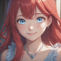 a choker necklace, and a brooch. Her expression is serene, and she wears a soft,