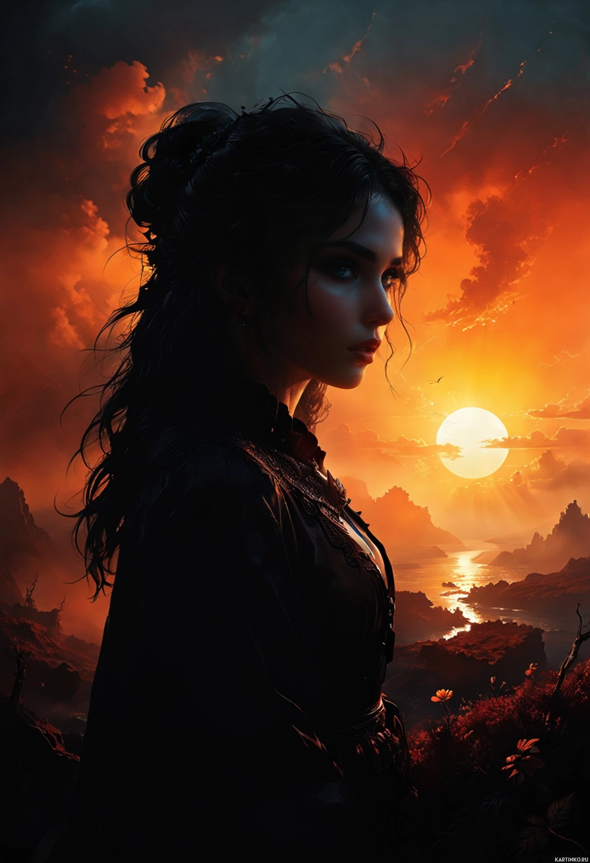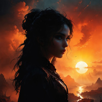 an otherworldly landscape with a fiery sky, possibly indicating a scene from a fictional story or game setting. The style of the artwork is detailed and vibrant, with a focus on dynamic