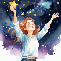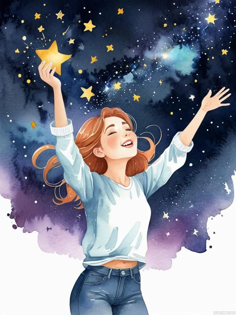 red hair, smiling and holding what appears to be a star in her hand. She is looking up towards the sky with her eyes closed. Her attire includes